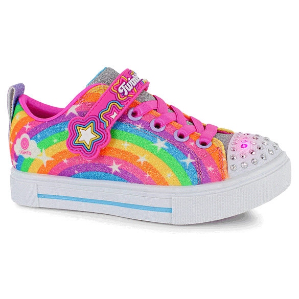 Light up the playground with celestial style wearing Skechers Twinkle Toes®: Twinkle Sparks - Starry Rainbow. This Skechers adaptive closure light-up sneaker features a glitter rainbow upper with star detail, satin stretch laces, adjustable instep strap, and a lighted rhinestone-embellished toe.